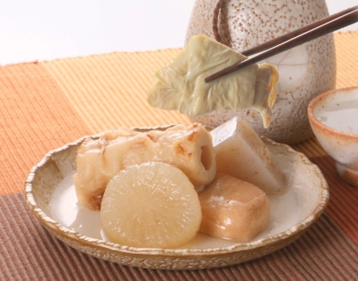 BUY NOW!醤油をベースに魚介のうま味でまろやかに仕上げただしを使用。手結びした肉厚のゆばが自慢です。他に焼麩、大根、焼きちくわ、こんにゃくとこだわりの具材を使用しました。